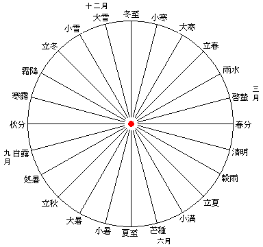 一周を15度ごとに区切ると24等分の区切りができます。一つの区切りは約15日間です。そしてこれらの節目に季節感を表す名前を付けたものが二十四節気です。
