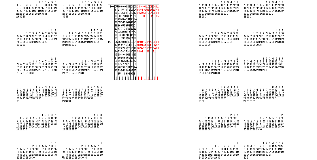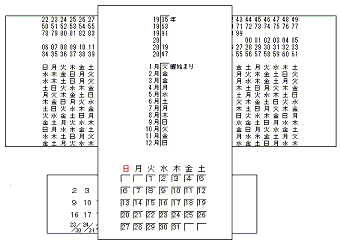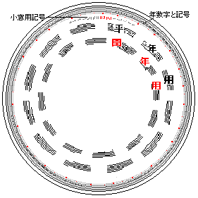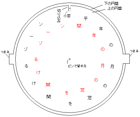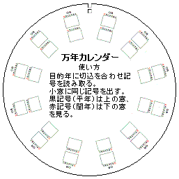 ---------------------------------------------------------------- 下の円盤概念図 下の円盤の外周には下図のように年数字がぐるりと書き込まれ、それぞれ 年数字と記号 太字で「平年用」「閏年用」と示してあるのは毎月の日付の数字群です。これ 毎月の日付の数字群の例 小窓用記号は上の円盤に開けた小窓に見える記号です。上下の円盤を重ね 小窓用記号 ------------------------------------------------------------------ 上の円盤概念図 上の円盤には上部に小さな切り込みと小窓が開いています。また「本格版」の ----------------------------------------------------------------- 作業順序 厚紙とコンパス、定規、分度器、細かい字を書くペン(黒、赤)、鉛筆、消しゴム、カッター、 まず厚紙で下の円盤を作る。半径は10〜20センチぐらい。 次に上の円盤を作る。半径は下の円盤の年数字が見える分だけ短くする。 次に上下の円盤を重ねて中心を仮にピン止めする。 上下の円盤を取り外し、下の円盤に写し取られた各月の横長の扇形の枠の中に1月〜12月 鉛筆書きした不要な線を消し、2枚の円盤を重ねて中心にピンを刺したら針の先を曲げて安 使い方は、まず下の円盤の外周に印された目的の年の数字に上の円盤の 概略図しか示しませんでしたが、窓に数字が現れる原理は5.の「本格版」