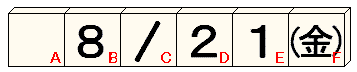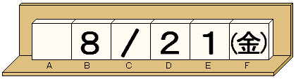 (前面に来ている数字の次の数字ができるだけ上面になるように書き込んでおくと操作しやすいでしょう。 大変面白い答えになりましたが、それでは本当にこれでよいのか一つ一つ確かめて まず、ABの位置に「 1」から「12」までができるかどうか見てみましょう。 次にDEの位置に「01」から「31」までができるでしょうか。 次に曜日の表示はどうでしょうか。 最後に、無駄なものは一切ないでしょうか。 |